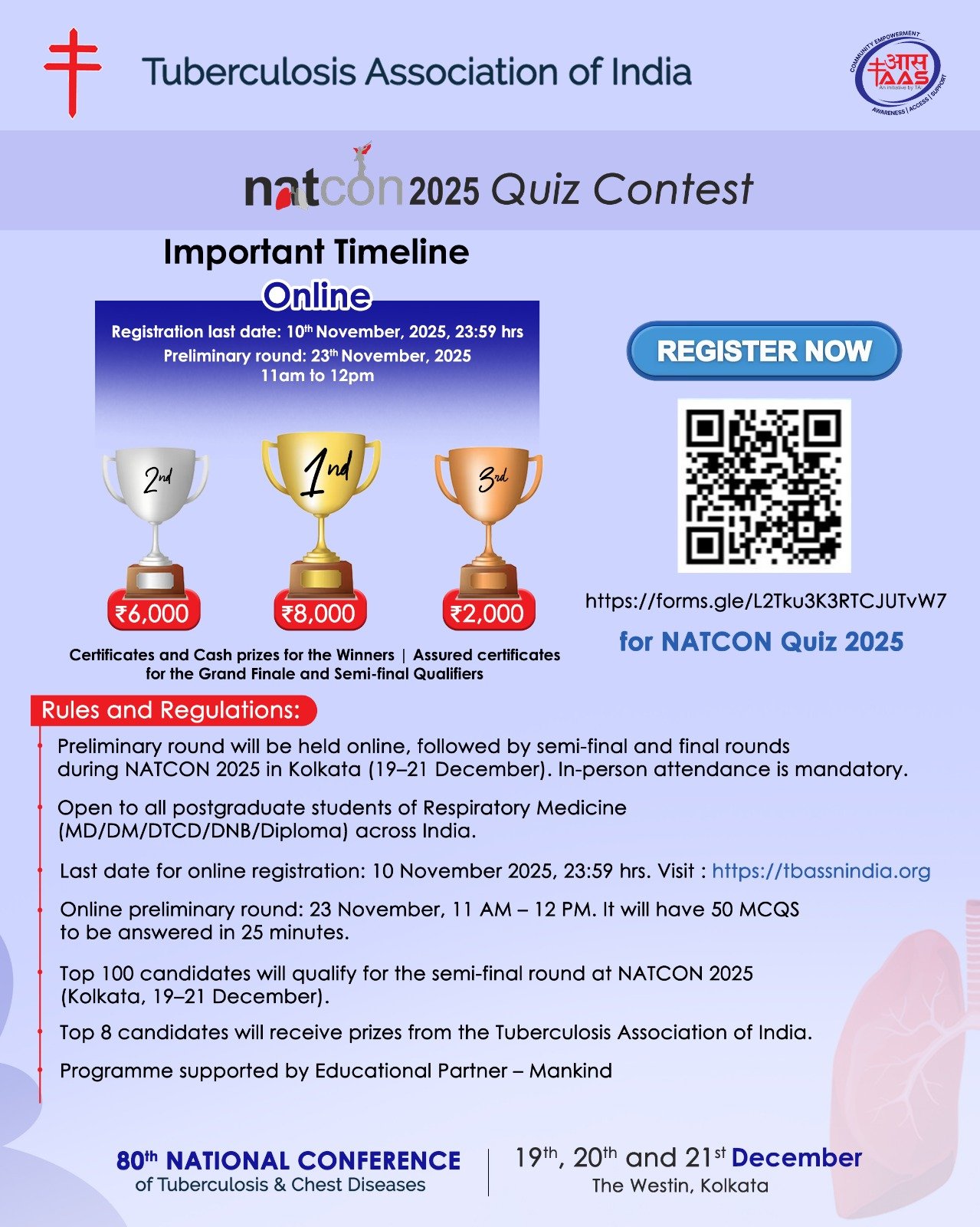 The Tuberculosis Association of India (TAI) has been serving the cause of tuberculosis since 1939. It is one of the oldest and largest voluntary organizations having its affiliates all over India. As a part of our continued endeavour to improve the knowledge and practice in the field of tuberculosis we are happy to announce a Quiz programme for postgraduate students. There will be a preliminary round (which will be online) followed by semi-final & final stage round (during NATCON the National TB conference to be held in Kolkata from 19th TO 21st December 2025 where in person attendance is mandatory).